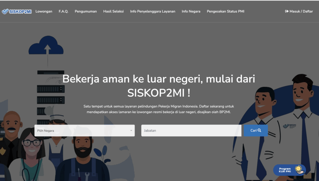 SISKOP2MI adalah website yang dikelola Kementerian Pelindungan Pekerja Migran Indonesia (KP2MI) untuk memfasilitasi proses penempatan dan pelindungan Pekerja Migran Indonesia (PMI). Website ini memungkinkan Calon Pekerja Migran Indonesia (CPMI) untuk mengakses informasi lowongan kerja resmi di luar negeri, mendaftar, dan mengikuti seluruh proses penempatan secara online.